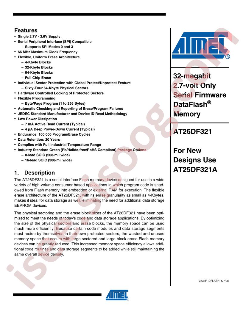 FLASH Memory IC 32Mb (256 Bytes x 16384 pages) SPI 66MHz 8-SOIC